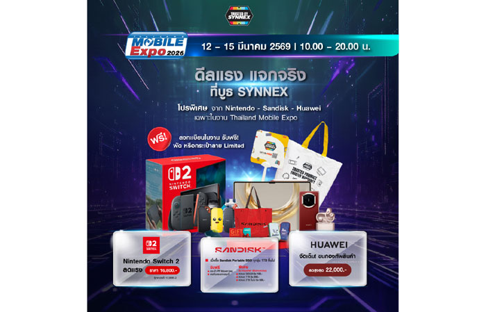 พบกันที่บูธของ SYNNEX พร้อมช้อปสินค้าไอทีราคาสุดคุ้ม และโปรโมชันพิเศษได้ภายในงาน Thailand Mobile Expo 2026 ณ ศูนย์การประชุมแห่งชาติสิริกิติ์ (QSNCC) ระหว่างวันที่ 12 – 15 มีนาคม 2569 บูธ SYNNEX CM12 Hall 5 เวลา 10.00 – 20.00 น.