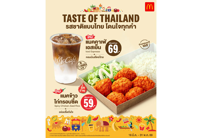 แมคโดนัลด์ จับเทรนด์ฮิต ชูความเป็นไทย สร้าง Brand Connection ผ่านการนำแรงบันดาลใจจากเมนูยอดนิยมของคนไทยมาพัฒนาความอร่อยในแบบฉบับแมคโดนัลด์ พร้อมถ่ายทอดเอกลักษณ์ของอาหารไทยผ่าน แคมเปญ ‘Taste of Thailand’ รสชาติแบบไทย โดนใจทุกคำ เปิดตัว 2 เมนู ใหม่ล่าสุด! ได้แก่ ‘แมคข้าวไก่กรอบซี้ด’ รสชาติจัดจ้าน อร่อยซี้ดถึงใจ กับไก่กรอบเนื้อแน่นที่คลุกเคล้ากับผงซี้ดรสจัดจ้านถึงเครื่องแบบไทยๆ อร่อยลงตัวกับผักกาดแก้วสดกรอบ เสิร์ฟพร้อมข้าวหอมมะลิไทยแท้ 100% เพียงจานละ 59 บาท และ ‘แมคคาเฟ่ เอสเย็น’ กาแฟหอมมันสไตล์ไทย จากกาแฟพรีเมี่ยมอาราบิก้า 100% ผสมความนัวของนม ใครเป็นสายกาแฟหวานมันแบบไทยๆ ต้องลอง ได้ดื่มรีเฟรชตัวเองง่ายๆ ทุกวัน ราคาเริ่มต้นแก้วละ 69 บาท หรือจะเลือกอร่อยคู่กัน ยิ่งเพิ่มความโดนใจทุกคำ!