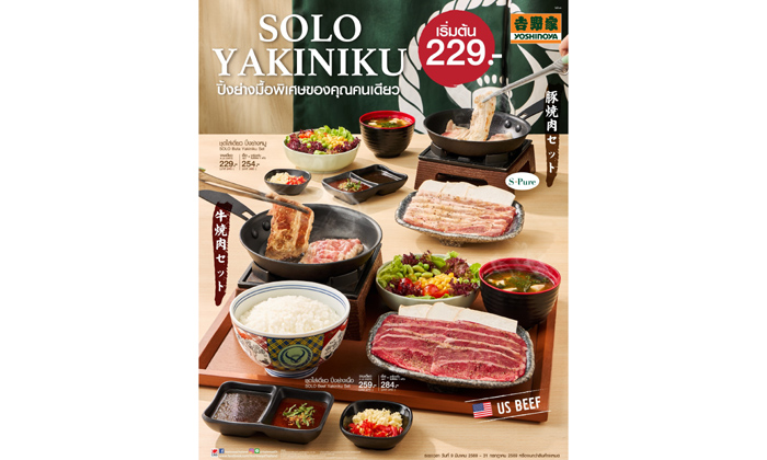 โยชิโนยะ (Yoshinoya) ร้านอาหารญี่ปุ่นต้นตำรับเมนูข้าวหน้าเนื้อ “กิวด้ง” ที่มีประวัติยาวนานกว่า 125 ปี จากประเทศญี่ปุ่น ภายใต้การบริหารของบริษัท เซ็นทรัล เรสตอรองส์ กรุ๊ป จำกัด (CRG) เดินหน้ารุกตลาดในประเทศ ไทย ด้วยการเปิดตัวเมนูใหม่ “SOLO YAKINIKU” ปิ้งย่างสไตล์ญี่ปุ่นแบบเซ็ตสำหรับรับประทานคนเดียว เพื่อตอบโจทย์ไลฟ์สไตล์ผู้บริโภคยุคใหม่ ในคอนเซ็ปต์ “ปิ้งย่างยุคใหม่ กินคนเดียวก็ฟินได้” โดยเริ่มจำหน่ายตั้งแต่วันที่ 9 มีนาคม – 31 กรกฎาคม 2569