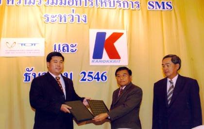 นายอรัญ เพิ่มพิบูลย์ (ที่ 2 จากขวา) รักษาการกรรมการผู้จัดการใหญ่ บริษัท ทศท คอร์ปอเรชั่น จำกัด (มหาชน) ทำการแลกเปลี่ยนสัญญากับ นายณัฐพล เขียวบริบูรณ์ (ที่ 1 จากซ้าย) กรรมการผู้จัดการ บริษัท กนกกฤตย์ จำกัด ในฐานะที่เป็นผู้ให้บริการเสริม SMS (Short Message Service) บนโครงข่ายโทรศัพท์ประจำที่ของ บริษัท ทศท คอร์ปอเรชั่น จำกัด (มหาชน) เป็นรายแรก ซึ่งจะให้บริการทั่วประเทศ โดยมีผู้บริหารของทั้งสองบริษัทร่วมเป็นสักขีพยาน ณ ห้องซาลอน C โรงแรม เจดับบลิว แมริออท