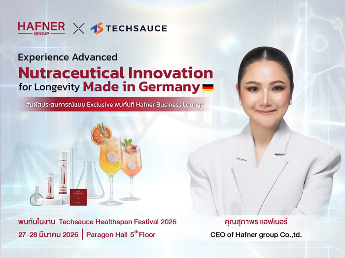 โอกาสสำคัญสำหรับนักธุรกิจและแบรนด์สุขภาพที่ต้องการยกระดับสู่สากล! HAFNER GROUP (ฮาฟเนอร์ กรุ๊ป) ในฐานะ Strategic Manufacturing Partner นำโดย สุภาพร แฮฟเนอร์ กรรมการผู้จัดการและผู้ก่อตั้ง เตรียมขนทัพนวัตกรรมและความเชี่ยวชาญด้านการผลิตระดับ World-Class จากฐานการผลิตในประเทศเยอรมนี มาร่วมจัดแสดงในงาน Techsauce Healthspan Festival 2026 มหกรรมนวัตกรรมสุขภาพครบวงจรที่ยิ่งใหญ่ที่สุด