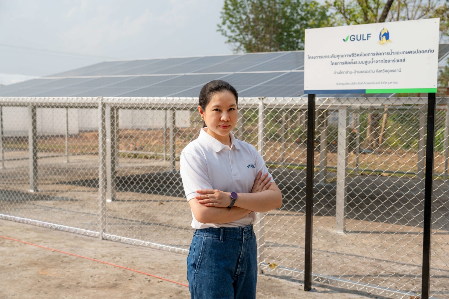 น.ส.ญาณิศา วัฒนคำนวณ ผู้อำนวยการด้านการบริหารฝ่ายกิจกรรมองค์กรเพื่อสังคม GULF กล่าวว่า “GULF ให้ความสำคัญกับส่งเสริมและพัฒนาคุณภาพชีวิตผู้คน โดยนำความรู้ความเชี่ยวชาญของธุรกิจมาเป็นส่วนหนึ่งในการทำงานเพื่อสังคม อย่างการทำงานร่วมกับมูลนิธิปิดทองหลังพระฯ ในพื้นที่บ้านโคกล่ามและบ้านแสงอร่าม GULF นำความเชี่ยวชาญด้านพลังงานหมุนเวียน โดยเฉพาะพลังงานแสงอาทิตย์ โซลาร์เซลล์ มาประยุกต์ใช้เพื่อบรรเทาภาระค่าใช้จ่ายด้านพลังงานที่ถือเป็นต้นทุนสำคัญของเกษตรกร โดยสนับสนุนการติดตั้งระบบสูบน้ำจากโซลาร์เซลล์และหอถังสูง พร้อมวางระบบท่อส่งน้ำและกระจายน้ำเข้าสู่แปลงเพาะปลูก ตลอดจนสนับสนุนโรงเรือนปลูกผักปลอดภัยจำนวน 10 โรงเรือน เพื่อสร้างงานสร้างรายได้ที่มั่นคงให้เกษตรกรในพื้นที่ นอกจากนี้ยังขยายระบบส่งน้ำไปยังพื้นที่แหล่งน้ำของชุมชน เพื่อให้ชุมชนมีน้ำใช้อย่างพอเพียงแม้ในช่วงฤดูแล้ง และยังสามารถปลูกผักและไม้ผล ไม้เศรษฐกิจ นำไปสู่การพัฒนาเป็นป่า 3 อย่าง ประโยชน์ 4 อย่าง นอกจากนี้ยังนำวิศวกรจาก GULF1 ซึ่งเป็นบริษัทในเครือที่มีความเชี่ยวชาญด้านโซลาร์เซลล์ มาถ่ายทอดองค์ความรู้เกี่ยวกับการดูแลรักษาโซลาร์ที่ถูกต้อง เพื่อการใช้งานอย่างมีประสิทธิภาพสูงสุด