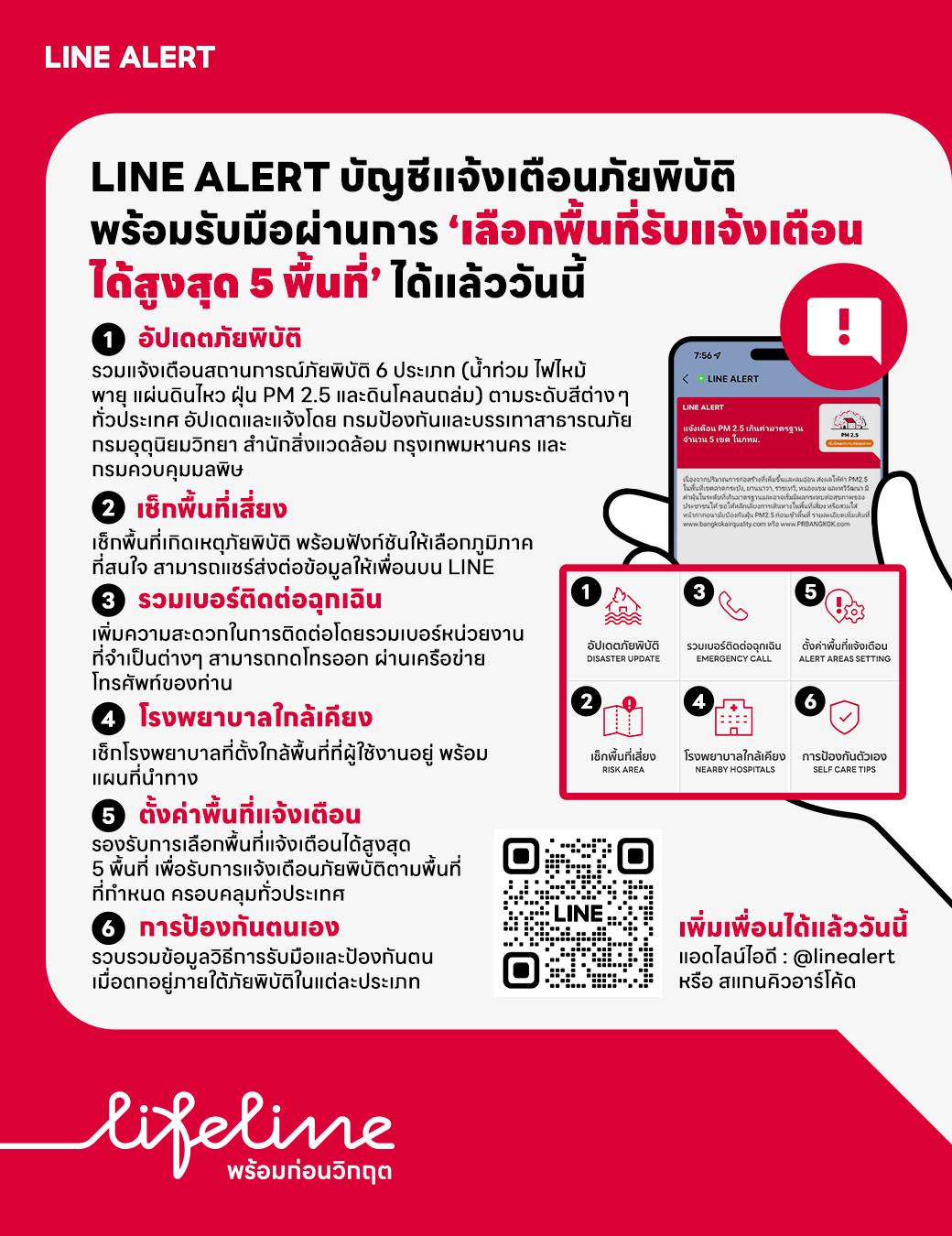 LINE ALERT หรือ บัญชีทางการ @linealert ซึ่งทำหน้าที่เป็นศูนย์กลางข้อมูลภัยพิบัติ 6 ประเภท ได้แก่ น้ำท่วม, ไฟไหม้, พายุ, แผ่นดินไหว, ฝุ่น PM2.5 และดินโคลนถล่ม โดยผนึกกำลังกับภาครัฐอย่าง กรมป้องกันและบรรเทาสาธารณภัย และกรมอุตุนิยมวิทยา เพื่อส่งต่อข้อมูลที่ถูกต้องแม่นยำ