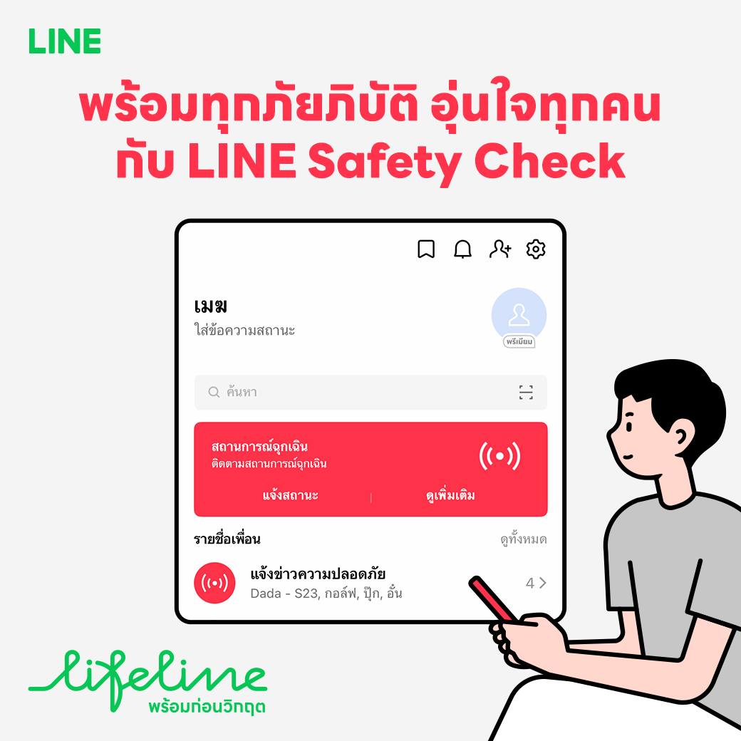 นอกจากระบบแจ้งเตือนแล้ว LINE ยังส่งฟีเจอร์ LINE Safety Check มาเพื่อช่วยตอบคำถามสำคัญในยามวิกฤตว่า “คนที่เรารักยังปลอดภัยดีไหม?” โดยผู้ใช้งานสามารถแจ้งสถานะความปลอดภัยของตนเอง และตรวจสอบสถานะของเพื่อนบน LINE ได้อย่างรวดเร็วโดยไม่ต้องรอให้ติดต่อกันไม่ได้เหมือนในอดีต