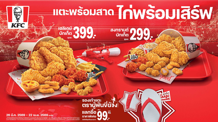 สงกรานต์นี้ ปล่อยจอยให้สุดกับเมนูพิเศษที่ KFC จัดเต็มมาเพื่อเทศกาลนี้โดยเฉพาะ ครบจบในชุดเดียว ในราคาเริ่มต้นเพียง 159 บาท พร้อมเสิร์ฟที่ KFC ทุกสาขาทั่วประเทศ (ยกเว้นสาขาสนามบินดอนเมืองและสุวรรณภูมิ) ตั้งแต่วันนี้ – 22 เมษายน 2569