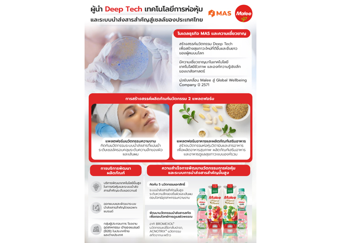 ‘บมจ. มาลี กรุ๊ป’ หรือ MALEE ประกาศทิศทางธุรกิจปี 2569 ส่ง มาลี แอพพลายด์ ไซเอ็นซ์ (Malee Applied Sciences หรือ MAS) เสริมทัพเพื่อทะยานสู่ ‘New Era of Wellness’ ชูความเชี่ยวชาญด้านวิทยาศาสตร์ระดับสูงและเภสัชกรรมระดับประเทศ เดินหน้าเปิดตัวสินค้าวัตถุดิบระดับแอดวานซ์ ‘นวัตกรรมนำส่งสารสำคัญที่แม่นยำในระดับเซลล์’ ตอบรับเมกะเทรนด์โลกด้านการดูแลสุขภาวะที่ยืนยาว ลุยตลาด B2B กลุ่มผลิตภัณฑ์เสริมอาหารและความงาม รุกเจาะตลาดผู้ประกอบการ โรงงานอุตสาหกรรม เจ้าของแบรนด์ และขยายสู่ตลาดยุโรป ญี่ปุ่น เกาหลีใต้ วางเป้าหมายให้ MAS เป็นกลไกสำคัญขับเคลื่อน มาลี กรุ๊ป ก้าวสู่การเป็น Global Wellbeing Company ในปี 2571