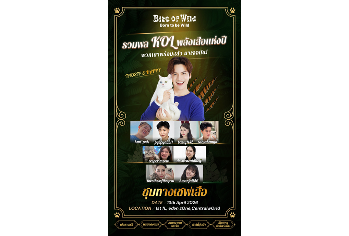 Bite of Wild (ไบต์ ออฟ ไวลด์) ผลิตภัณฑ์อาหารแมวภายใต้การผลิตและนำเข้าโดย เพ็ทเอาร์ (ประเทศไทย) จัดงานต้อนรับมหาสงกรานต์ชวนเหล่าทาสแมวมารวมตัวชุมนุมในงาน “ชุมทางเชฟเสือ” เพื่อเปิดประสบการณ์มื้อสุดพิเศษสำหรับเหล่าเสือน้อยของคุณกับผลิตภัณฑ์อาหารแมวจากวัตถุดิบธรรมชาติแท้ คุณภาพเยี่ยม สดใหม่ การันตีเนื้อแท้แน่นทุกคำ ดีต่อใจที่สุดใน South East Asia พร้อมเนรมิตลาน Eden ให้กลายเป็นป่าเขตร้อนปลุกพลังเสือในตัวแมวให้ตื่นขึ้น พบกับ เต๋า – เศรษฐพงศ์ เพียงพอ และ น้องแฮปปี้ น้องแมวตาแป๋วที่ทำให้ใครหลายคนต้องใจละลาย พร้อมด้วยเหล่าอินฟลูเอนเซอร์ Cat Lovers กว่าร้อยคนในงาน ไฮไลท์ห้ามพลาด! Cat Met Gala Red Carpet และกิจกรรมหลากหลายที่พร้อมเสิร์ฟ อาทิ ชมแมวไทยหายาก 5 สายพันธุ์, งานประกาศรางวัลสุดยอดแมวในแบบ Bite of Wild ปิดท้ายด้วยปาร์ตี้คาร์นิวัลสุดลึกลับที่จะมาปลุกพลังเสือของคุณและน้องแมว เข้าชมฟรี! จันทร์ที่ 13 เมษายนนี้ ณ ชั้น 1 ลาน Eden ศูนย์การค้าเซ็นทรัลเวิลด์ ตั้งแต่เวลา 13:00 น. เป็นต้นไป