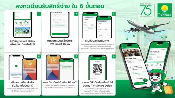 ลูกค้าสามารถใช้สิทธิ์ TVI Smart Delay ได้อย่างสะดวกผ่านแอปพลิเคชัน Thaivivat เพียงลงทะเบียนเที่ยวบินล่วงหน้าอย่างน้อย 24 ชั่วโมง ระบบจะตรวจสอบสถานะเที่ยวบินแบบอัตโนมัติ และเมื่อเกิดการดีเลย์ตามเงื่อนไข ลูกค้าจะได้รับ QR Code เพื่อเข้าใช้บริการ Lounge ได้ทันที รวมถึงสามารถจัดการข้อมูลผู้เดินทาง เพิ่ม-ลดรายชื่อ และตรวจสอบห้องรับรองได้ในแอปเดียว สะท้อนความเป็น Digital Convenience อย่างสมบูรณ์