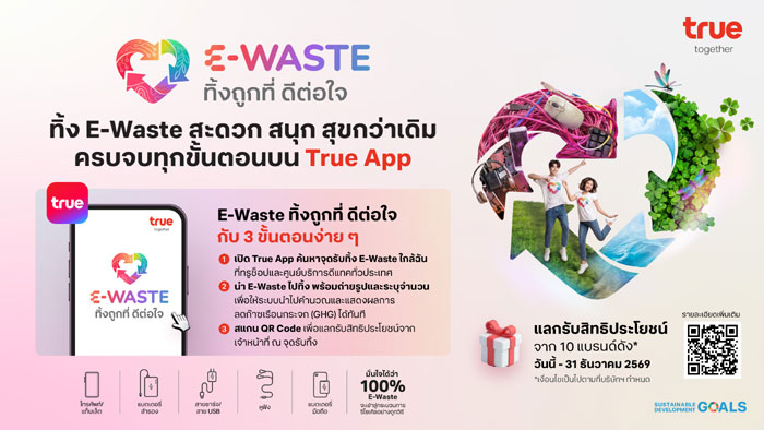 ในวันที่ขยะอิเล็กทรอนิกส์กำลังเพิ่มขึ้นอย่างรวดเร็ว และกลายเป็นหนึ่งในความท้าทายด้านสิ่งแวดล้อมของโลก “การตัดสินใจเล็กๆ ของผู้บริโภค” จึงมีพลังสร้างการเปลี่ยนแปลงได้มากกว่าที่เคย เนื่องในวันคุ้มครองโลก 2569 หรือ Earth Day 2026 ภายใต้แนวคิด “Our Power, Our Planet” ทรู คอร์ปอเรชั่น เดินหน้าขับเคลื่อนบทบาทเทคคอมปานีไทยที่ใส่ใจสิ่งแวดล้อม ร่วมกับพันธมิตรชั้นนำกว่า 10 แบรนด์ ยกระดับ โครงการ “E-Waste ทิ้งถูกที่ ดีต่อใจ” สู่ Digital Ecosystem ครบจบบน True App เป็นครั้งแรก ที่เชื่อมต่อทุกขั้นตอนของการจัดการขยะอิเล็กทรอนิกส์ไว้ในที่เดียว ตั้งแต่การค้นหาจุดทิ้ง E-Waste ใกล้ตัวแบบเรียลไทม์ การนำไปทิ้งได้อย่างสะดวก ไปจนถึงการ “รู้ผลทันที” ว่าช่วยลดผลกระทบต่อสิ่งแวดล้อมได้มากน้อยเพียงใด พร้อมเลือกรับสิทธิประโยชน์โดนใจจากพันธมิตรชั้นนำ เปลี่ยน “การทิ้ง” ให้กลายเป็น “การมีส่วนร่วม” ที่วัดผลได้จริง