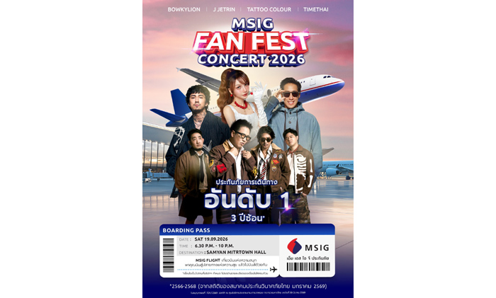 เพื่อขอบคุณและตอบแทนลูกค้าที่ให้ความไว้วางใจกว่า 10 ปีในผลิตภัณฑ์ประกันภัยเดินทางต่างประเทศของบริษัท MSIG เตรียมจัดคอนเสิร์ตใหญ่ “MSIG Fan Fest 2026” พร้อมมอบสิทธิพิเศษสำหรับผู้ที่ซื้อประกันภัยการเดินทาง MSIG Travel Easy Plus ระหว่างวันที่ 1 เมษายน – 30 มิถุนายน 2569 ดังนี้