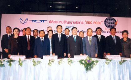 นายแพทย์สุรพงษ์ สืบวงศ์ลี รัฐมนตรีว่าการกระทรวง เทคโนโลยีสารสนเทศและการสื่อสาร เป็นประธานพิธีลงนามสัญญาบริการ “EDC Pool” หรือศูนย์กลางระบบเครือข่ายเครื่องรับชำระเงินผ่านบัตรเครดิตที่ช่วยลดทั้งต้นทุนค่าใช้จ่ายของร้านค้าและธนาคาร ทำให้สามารถทำธุรกรรมผ่านบัตรเครดิตได้อย่างปลอดภัย คล่องตัวทุกพื้นที่ทั่วไทย ด้วยค่าบริการที่ต่ำกว่าเดิมระหว่าง บมจ.อินเทอร์เน็ตประเทศไทย และ บมจ. ทศท คอร์ปอเรชั่น ณ อาคาร 9 บมจ.ทศท คอร์ปอเรชั่น เมื่อเร็วๆ นี้