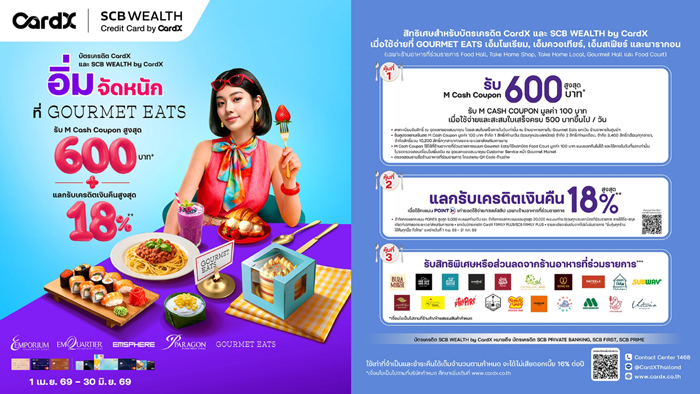 บริษัท คาร์ด เอกซ์ จำกัด (CardX) ผู้ให้บริการบัตรเครดิตและสินเชื่อบุคคลภายใต้กลุ่มเอสซีบีเอกซ์ เดินหน้าตอกย้ำความเป็นผู้นำด้านไลฟ์สไตล์การเงินระดับพรีเมียม ร่วมกับ กูร์เมต์ อีทส์ (Gourmet Eats) ธุรกิจอาหารในเครือเดอะมอลล์ กรุ๊ป เพื่อเอาใจนักชิมให้เพลิดเพลินกับร้านดังและเมนูฮิตแบบจัดเต็ม จัดแคมเปญพิเศษ “อิ่มจัดหนัก ที่ Gourmet Eats” มอบสิทธิประโยชน์สุดเอ็กซ์คลูซีฟ เพื่อเติมเต็มประสบการณ์ การรับประทานอาหารให้คุ้มค่ายิ่งขึ้น สำหรับบัตรเครดิต CardX และ SCB WEALTH by CardX ที่ กูร์เมต์ อีทส์ สาขาเอ็มโพเรียม, เอ็มควอเทียร์, เอ็มสเฟียร์ และ พารากอน ตั้งแต่วันที่ 1 เมษายน – 30 มิถุนายน 2569