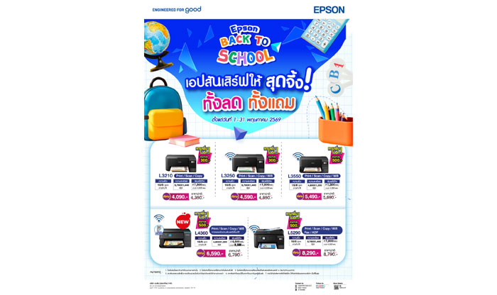 เอปสัน ประเทศไทย เดินหน้ากระตุ้นตลาดช่วงเปิดภาคเรียน เปิดแคมเปญ “Epson Back to School” อัดโปร ทั้งลดทั้งแถม เอาใจนักเรียน นักศึกษา และผู้ปกครอง ด้วยไลน์อัพเครื่องพิมพ์ Epson EcoTank รุ่นยอดนิยมที่โดดเด่นด้านความประหยัดหมึก รองรับการพิมพ์ปริมาณมาก ครบทั้งพิมพ์ สแกน และถ่ายเอกสาร เริ่มตั้งแต่วันที่ 1–31 พฤษภาคม 2569 เมื่อซื้อสินค้าที่ร้านค้าที่ร่วมรายการ โดยรุ่นไฮไลต์ อาทิ L3210 ราคา 4,090 บาท, L3250 ราคา 4,590 บาท, L3550 ราคา 5,490 บาท, L4360 ราคา 6,590 บาท และ L5290 ราคา 8,290 บาท พร้อมรับบัตรกำนัลสูงสุด 500 บาท ตอบโจทย์ทั้งการเรียน การทำรายงาน และงานสร้างสรรค์ได้อย่างคุ้มค่า
