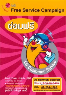บริษัท แอลจีมิตร อีเลคทรอนิคส์ จำกัด จัดแคมเปญพิเศษ “LG Free Service” เพื่อให้บริการซ่อมสินค้าแอลจีทุกชนิด ซึ่งเป็นการดำเนินงานที่สอดคล้องกับที่ในปีนี้ แอลจีได้ประกาศใช้สโลแกนใหม่ “LG Life’s Good” โดยตั้งแต่วันนี้ถึง 20 มีนาคม ศกนี้ ลูกค้าสามารถนำผลิตภัณฑ์แอลจีที่ใช้อยู่มาตรวจสอบสภาพและรับบริการซ่อมได้ที่ศูนย์บริการของแอลจีกว่า 130 สาขาทั่วประเทศ ดดยไม่ต้องเสียค่าซ่อมแซมและค่าอะไหล่ไม่เกิน 2,000 บาท ผู้สนใจสอบถามได้ที่ศูนย์บริการ LG Service Center โทร.1800-54-54-54 และ 02-204-1888