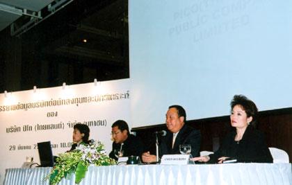 นายพิเสฐ จึงแย้มปิ่น ประธานกรรมการบริษัท ปิโก (ไทยแลนด์) จำกัด (มหาชน) (ที่ 2 จากขวา) นำทีมผู้บริหารบริษัทจัดการบรรยายภาพรวมและการเติบโตของธุรกิจต่อสภาวะการณ์ของตลาดหุ้นในปัจจุบัน (Public Hearing) ก่อนนำเสนอขายหุ้นให้กับประชาชนในวันที่ 31 มีนาคม และวันที่ 1-2 เมษายน 2547 ผ่านบริษัทจัดจำหน่ายหุ้นและรับประกันการจำหน่าย โดยมีนางศศิธร พงศธร กรรมการผู้อำนวยการบริษัทหลักทรัพย์ ยูไนเต็ด จำกัด (มหาชน) (ที่ 1 จากขวา) ในฐานะบริษัทที่ปรึกษาทางการเงินและแกนนำบริษัทจัดจำหน่ายหุ้นและรับประกันการจำหน่าย เข้าร่วมชี้แจง ณ โรงแรม เจ ดับบลิว แมริออท