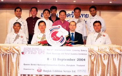 นายกสมาคมพ่อครัวไทย คุณจำนงค์ นิรังสรรค์ (นั่งที่ 2 จากซ้าย) เซ็นสัญญาร่วมกับ มร.เดวิท เอทคิน ผู้จัดการทั่วไปบริษัท แบงค็อค เอ็กซ์ซิบิชั่น เซอร์วิสเซส จำกัด (บีอีเอส) (นั่งที่ 2 จากขวา) ณ โรงแรมรามาการ์เดนท์ เพื่อตอบรับสนับสนุนงาน ดิ อินเตอร์เนชั่นแนล ฟู้ด แอนด์ ฮอสพิทอลลิตี้ โชว์ 2004 และร่วมจัดกิจกรรมเปิดงานชุมนุมผู้ประกอบการอาหารและพ่อครัวระดับประเทศครั้งที่ 10 ซึ่งงานนี้จะจัดขึ้นระหว่างวันที่ 8-11 กันยายน 2547 ณ ศูนย์การประชุมแห่งสิริกิติ์ กรุงเทพฯ