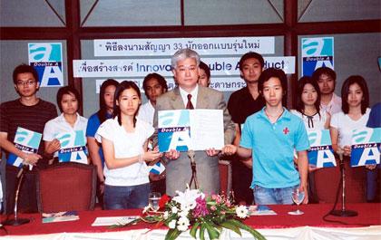 นายชาญวิทย์ จารุสมบัติ ผู้ช่วยกรรมการผู้จัดการใหญ่ – การตลาด ดั๊บเบิ้ล เอ ร่วมเซ็นสัญญากับบรรดานักศึกษาและนักออกแบบรุ่นใหม่เข้าโครงการ Innovative Double A Product เพื่อร่วมออกแบบผลิตภัณฑ์เครื่องเขียน เครื่องใช้สำนักงาน ปฏิวัติวงการเครื่องเขียนของไทยให้มีความโดดเด่นด้านดีไซน์ โดยมีผลิตภัณฑ์นำร่องแล้ว 2 ผลงาน คือ กระดาษกระป๋อง และ โน้ตแบ็ก