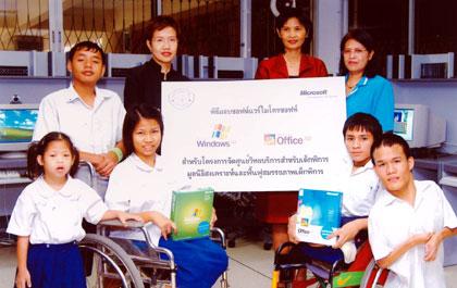 บริษัท ไมโครซอฟท์ (ประเทศไทย) จำกัด โดยนางเอื้อมพร ปัญญาใส (ซ้าย) ผู้จัดการฝ่ายพัฒนาธุรกิจ มอบซอฟต์แวร์ลิขสิทธิ์ของไมโครซอฟท์ ซึ่งประกอบด้วย ระบบปฏิบัติการไมโครซอฟท์? วินโดวส์? เอ็กซ์พี และไมโครซอฟท์? ออฟฟิศ เอ็กซ์พี จำนวน 20 ชุด ให้กับศูนย์วิทยบริการสำหรับเด็กพิการ โรงเรียนประชาบดี ในมูลนิธิสงเคราะห์และฟื้นฟูสมรรถภาพเด็กพิการ โดยมี อาจารย์พเยาว์ บังผล (กลาง) หัวหน้าโครงการสอนเด็กพิการและทุพพลภาพ และอาจารย์รสสุคนธ์ ภู่เกลี้ยง (ขวา) กรรมการโครงการฯ เป็นผู้รับมอบ เมื่อเร็วๆ นี้ ที่โรงเรียนประชาบดี โดยชอฟต์แวร์ของไมโครซอฟท์ดังกล่าวจะเข้าไปมีส่วนช่วยส่งเสริมการเรียนรู้และพัฒนาศักยภาพของเด็กในมูลนิธิฯ