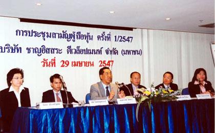 นางสงกรานต์ อิสสระ กรรมการผู้จัดการ บริษัท ชาญอิสสระ ดีเวล็อปเมนท์ จำกัด (มหาชน) เป็นประธานในการประชุมสามัญผู้ถือหุ้น ประจำปี 2547 พร้อมด้วยนายพิสุทธิ์ เดชะไกศยะ (ที่ 3 จากขวา) ประธานกรรมการตรวจสอบและคณะกรรมการตรวจสอบ ร่วมชี้แจงต่อที่ประชุม เมื่อวันที่ 29 เมษายน 2547 ณ ห้องประชุมชั้น 10 อาคารชาญอิสสระทาวเวอร์ 2 ถนนเพชรบุรีตัดใหม่
