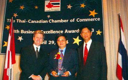 นายสงวน ตรีเจริญวิวัฒน์ กรรมการผู้อำนวยการสายธุรกิจภาครัฐ (กลาง) บริษัท สามารถคอมเทค จำกัด รับมอบรางวัล Best Thai Partner 2003 โดยมี ดร.แอนดูรว์ แม็กอลิสเตอร์ (ซ้าย) เอกอัครราชทูตแคนาดา ประจำประเทศไทย และนายอารมณ์ พรประพันธ์ Channel Partner Management บริษัท นอร์เทล เน็ทเวิร์คส์ (ประเทศไทย) จำกัด (ขวา) ร่วมแสดงความยินดี ซึ่งการประกาศรางวัลนี้ จัดโดยสมาคมหอการค้าไทย-แคนาดา เพื่อเป็นการประกาศเกียรติคุณแก่บริษัทภาครัฐและเอกชน ที่มีส่วนสำคัญในการสร้างความสัมพันธ์อันดีทางการค้า ระหว่างประเทศไทยและแคนาดา ณ โรงแรมเชอราตัน แกรนด์ เมื่อเร็วๆ นี้