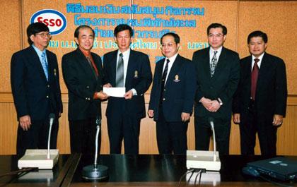 นายพิภพ พฤกษมาศน์ (ที่ 2 จากซ้าย) กรรมการและผู้จัดการประชาสัมพันธ์ บริษัท เอสโซ่ (ประเทศไทย) จำกัด (มหาชน) มอบเงินจำนวน 100,000 บาท ให้แก่ รศ. ดร.วิชัย เชิดชีวศาสตร์ (ที่ 3 จากซ้าย) รองคณบดี ฝ่ายกิจการนิสิต คณะวิทยาศาสตร์ จุฬาลงกรณ์มหาวิทยาลัย เพื่อสนับสนุนขมรมพิทักษ์ทะเล ภาควิชาวิทยาศาสตร์ทางทะเล ในการจัดค่ายอบรมวิทยาศาสตร์ทางทะเล ครั้งที่ 24 เพื่อเผยแพร่ความรู้ความเข้าใจเกี่ยวกับวิทยาศาสตร์ทางทะเล และปลุกจิตสำนึกในการอนุรักษ์ฟื้นฟูทรัพยากรและสภาพแวดล้อมทางทะเล ให้แก่เยาวชนในระดับชั้นมัธยมศึกษาตอนปลาย พิธีมอบจัดขึ้นเมื่อเร็วๆ นี้ ที่คณะวิทยาศาสตร์ จุฬาลงกรณ์มหาวิทยาลัย
