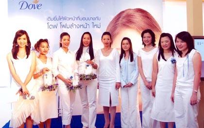 จากภาพ นางสาวสุทธิพา ปัญญามหาทรัพย์ ผู้จัดการฝ่ายการตลาดผลิตภัณฑ์โดฟ (ที่ 5 จากขวา) นางนริสสา อมรวิวัฒน์ (ที่ 3 จากขวา) ผู้จัดการกลุ่มผลิตภัณฑ์โดฟ นางสาวสุชีรา รุจิธรรมกุล ผู้จัดการฝ่ายวิจัยและพัฒนาผลิตภัณฑ์โดฟ (ที่ 4 จากขวา) นางสาวตรีดาว อภัยวงศ์ (ที่ 2 จากซ้าย) อาจารย์สอนการแสดง จุฬาลงกรณ์มหาวิทยาลัย นางสาวธีรนัยน์ ณ หนองคาย (ที่ 3 จากซ้าย) นางเอกละครเพลง “คู่กรรม” และครูสอนร้องเพลง และแพทย์หญิงอาสิรี ศรีวราพงศ์ (ที่ 4 จากซ้าย) แพทย์ผู้เชี่ยวชาญด้านผิวหนัง ซึ่งมาร่วมแบ่งปันประสบการณ์น่ารู้เกี่ยวกับผิวหน้า