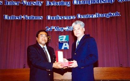 นายชาญวิทย์ จารุสมบัติ ผู้ช่วย กรรมการผู้จัดการใหญ่-การตลาด ดั๊บเบิล เอ รับมอบของที่ระลึกจาก นายบัญชา สกุลดี ผู้ช่วยรองอธิการบดีฝ่ายกิจการนิสิต มหาวิทยาลัยอัสสัมชัญ ในฐานะผู้สนับสนุนการแข่งขันโต้วาทีนานาชาติ ภูมิภาคเอเชีย ครั้งที่ 11 (11th All Asian Inter – Varsity Debating Championship “Queen’s Cup”) ณ หอประชุมองค์การสหประชาชาติ เมื่อเร็วๆ นี้ โดยมีนักเรียนนักศึกษาตั้งแต่ระดับมัธยมศึกษาถึงระดับอุดมศึกษาทั่วเอเชียเข้าร่วมการแข่งขันกว่า 500 คน