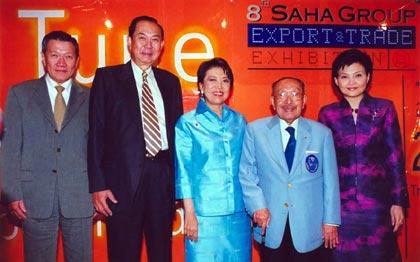 ศูนย์ประชุมแห่งชาติสิริกิติ์ – นายบุณยสิทธิ์ โชควัฒนา (ที่ 2 จากซ้าย) ประธานเครือสหพัฒน์ นายบุญเกียรติ โชควัฒนา (ซ้าย) กรรมการผู้อำนวยการ บมจ.ไอ.ซี.ซี. อินเตอร์เนชั่นแนล นางเพ็ญนภา ธนสารศิลป์ (ขวา) กรรมการ บมจ.สหพัฒนพิบูล ร่วมกับนางจันทรา บูรณฤกษ์ (กลาง) อธิบดีกรมส่งเสริมการส่งออก และศ.นพ.ประสพ รัตนากร (ที่ 2 จากขวา) ประธานมูลนิธิรัฐบุรุษ แถลงข่าวความร่วมมือในการจัดงานแสดงสินค้าเพื่อการส่งออกเครือสหพัฒน์ หรือ Saha Group Export & Trade Exhibition ครั้งที่ 8 ซึ่งจะจัดขึ้นในวันที่ 2-4 กรกฎาคม ศกนี้ ณ ศูนย์ประชุมแห่งชาติสิริกิติ์