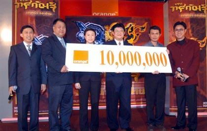 กรุงเทพฯ – 16 มิถุนายน 2547 – บริษัท ทีเอ ออเร้นจ์ จำกัด ผู้นำด้านการให้บริการระบบการสื่อสาร wireless? ภายใต้แบรนด์ออเร้นจ์ มอบเงินรางวัลมูลค่า 10 ล้านบาท ซึ่งนับเป็นรางวัลที่มีมูลค่าสูงสุดในแวดวงเกมโชว์ในประเทศไทย แก่นายสมพร พิณตะคุ แชมป์คนล่าสุดที่คว้าแจ็คพอตจากรายการเกมทศกัณฑ์ของบริษัท เวิร์คพอยท์ เอ็นเตอร์เทนเมนท์ รายการเกมโชว์ที่อัดแน่นด้วยสาระและความบันเทิงเพื่อผู้บริโภคชาวไทย ซึ่งสอดคล้องกับปรัชญาการดำเนินธุรกิจของออเร้นจ์ที่มั่งมุ่นในการสร้างสรรค์บริการด้านการสื่อสารไร้สายใหม่ๆ ที่เป็นประโยชน์และให้ความบันเทิงสำหรับผู้บริโภคชาวไทยอย่างต่อเนื่อง