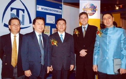 ในภาพ ผู้บริหารของบริษัทที.เอ็น.และเอสเอพี ให้การต้อนรับ นพ.สุรพงษ์ สืบวงศ์ลี รัฐมนตรีว่าการกระทรวงเทคโนโลยีสารสนเทศและการสื่อสาร (จากซ้าย) คุณอนันต์ จารุวิทยโกวิท ผู้จัดการทั่วไป แผนกการตลาด คุณวันชัย หุตะภิญโญ ผู้จัดการทั่วไป บริษัท ที.เอ็น.อินฟอร์เมชั่น ซิสเท็มส์ จำกัด มร.ฮันส์-ปีเตอร์ เคลย์ ประธานเจ้าหน้าที่บริหารระดับสูง บริษัท เอสเอพี เอเชีย แปซิฟิก และ มร.อลัน เซ็ดจีห์ กรรมการผู้จัดการ บริษัท เอสเอพี (ประเทศไทย) จำกัด