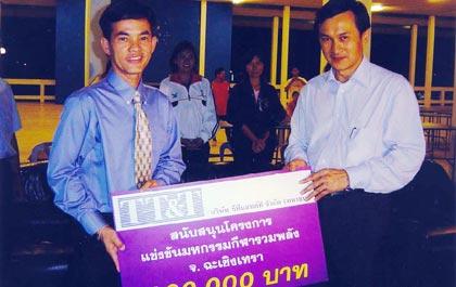 จาตุรนต์ ฉายแสง (ขวา) รองนายกรัฐมนตรี รับมอบเงินสนับสนุนการแข่งขันมหกรรมกีฬารวมพลัง จ.ฉะเชิงเทรา ครั้งที่ 1 จากนายอรรคณัฐ มณีศิริ (ซ้าย) รองผู้อำนวยการภาคตะวันออก บริษัท ทีทีแอนด์ที จำกัด (มหาชน) เพื่อร่วมส่งเสริมนโยบายของรัฐบาลในเรื่องการเล่นกีฬาของเยาวชน เมื่อเร็วๆ นี้