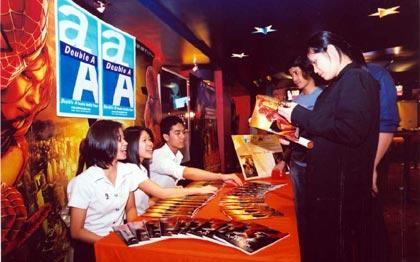 นิสิตจากจุฬาลงกรณ์มหาวิทยาลัย หนึ่งในกลุ่มนักศึกษาที่เข้าร่วมโครงการ “สนับสนุนกิจกรรมเพื่อสังคมของนักศึกษามหาวิทยาลัย ครั้งที่ 1” กำลังจำหน่ายสมุดจากโครงการฯ ซึ่งเกิดจากความร่วมมือระหว่าง ดั๊บเบิ้ล เอ และโคลัมเบีย ไทรสตาร์ฯ ในการผลิตสมุดปกภาพยนตร์ฟอร์มยักษ์ 2 เรื่อง คือ Spiderman 2 และ King Arthur ให้กับกลุ่มนักศึกษานำไปจำหน่ายเพื่อหารายได้ทำกิจกรรมช่วยเหลือสังคมในรูปแบบต่างๆ โดยได้เริ่มจำหน่ายแล้ว ณ บริเวณโรงภาพยนตร์แกรนด์อีจีวี สยามดิสคัฟเวอรี่เซ็นเตอร์ เมื่อเร็วๆ นี้ และจะมีจำหน่ายทั้งในสถานศึกษาหลายแห่ง และโรงภาพยนตร์ที่ฉายภาพยนตร์ 2 เรื่องนี้