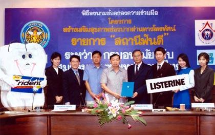 น้ำยาบ้วนปากลิสเตอรีน และหมากฝรั่งไทรเด้นท์ จับมือร่วมสนับสนุนโครงการสร้างเสริมสุขภาพช่องปากผ่านทางโทรทัศน์ระหว่างกรมอนามัย กระทรวงสาธารณสุข กับสมาคมทันตแพทย์เอกชนไทย พร้อมเปิดตัวรายการโทรทัศน์ใหม่ “สถานีฟันดี” ทางสถานีโทรทัศน์สีกองทัพบกช่อง 5 เพื่อมุ่งเผยแพร่ความรู้ และประชาสัมพันธ์งานทันตสาธารณสุขแก่ประชาชนทั่วประเทศ