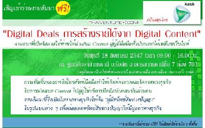 เชิญเข้าร่วมงานสัมมนา ฟรี! หัวข้อ WDigital Deals การสร้างรายได้จาก Digital Content” ในวันพุธที่ 18 สิงหาคม 2547 ณ ศูนย์ศึกษาสาทรธานี ม.รังสิต อาคารสาทรธานี ชั้น 7 ห้อง 701 เวลา 09-00 – 16.00 น.