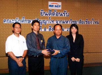 กรุงเทพฯ – สิงหาคม 2547 – คุณสานิท การุณยวนิช ผู้จัดการทั่วไป สมาคมการแสดงสินค้า (ไทย) และ ดร.รวี ลงกาณี อาจารย์ประจำคณะบริหารธุรกิจ สาขาการเงินและการธนาคาร นำนักศึกษาปริญญาโทจำนวน 80 คน จากมหาวิทยาลัยเชียงใหม่ เยี่ยมชมงาน “บางกอก อินเตอร์เนชั่นแนล ไอซีที เอ็กซ์โป 2004” โดยมีคุณทาลูน เทง ผู้จัดการทั่วไป ฝ่ายปฏิบัติการ และคุณนวรัตน์ กฤษณวงษ์หงษ์ ผู้ช่วยผู้จัดการทั่วไป ให้การต้อนรับ ณ ห้องประชุม 7 ศูนย์การประชุมอิมแพ็ค เมืองทองธานี