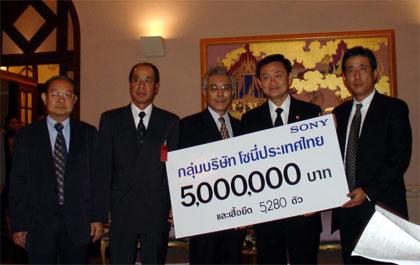 กลุ่มบริษัทโซนี่ในประเทศไทย และพนักงาน ตระหนักถึงความจำเป็นที่คนไทยทุกคนต้องร่วมช่วยเหลือผู้ประสบภัยพิบัติครั้งนี้อย่างเร่งด่วน ได้ร่วมบริจาคเงิน จำนวน 5,000,000 บาท (ห้าล้านบาทถ้วน) และเสื้อยืดโซนี่ จำนวน 5,280 ตัว ให้กับกองทุนเงินช่วยเหลือผู้ประสบสาธารณภัย สำนักนายกรัฐมนตรี เพื่อนำไปช่วยเหลือผู้ประสบภัย โดยคณะกรรมการผู้จัดการกลุ่มบริษัท โซนี่ประเทศไทย นำโดยนายคาซูโอะ ซูยามา กรรมการผู้จัดการ ได้เข้าพบและมอบของดังกล่าวให้กับ ฯพณฯ นายกรัฐมนตรี พ.ต.ท.ด.ร. ทักษิณ ชินวัตร ในวันที่ 28 ธันวาคม ที่ทำเนียบรัฐบาล