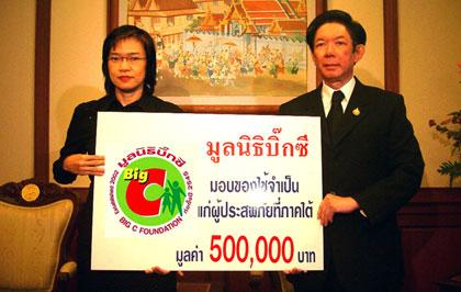 น.ส. รัมภา คำหอมรื่น (ซ้าย) รองประธานฝ่ายการเงินและการบัญชี บริษัท บิ๊กซี ซูเปอร์เซ็นเตอร์ จำกัด (มหาชน) เป็นตัวแทนบิ๊กซี ซูเปอร์เซ็นเตอร์มอบสิ่งของเครื่องใช้ที่จำเป็นช่วยผู้ประสบภัยคลื่นยักษ์ สึนามิที่ภาคใต้ เช่น เสื้อผ้าทั้งเด็กและผู้ใหญ่ รองเท้า ยาสีฟัน แปรงสีฟัน ผ้าเช็ดตัว และเครื่องใช้จำเป็นอื่นๆ อีกมากมายเป็นมูลค่า 500,000 บาท โดย ดร. รองพล เจริญพันธุ์ ปลัดสำนักนายกรัฐมนตรี เป็นผู้รับมอบที่ทำเนียบรัฐบาล เมื่อเร็วๆ นี้