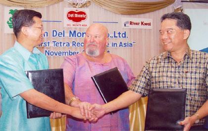 Mr.Andrew L. Cushman, Managing Director, Del Monte Asia Pte. Ltd. นายพิพัฒน์ สุกิจปาณีนิจ กรรมการผู้จัดการ บริษัท สามร้อยยอด จำกัด และนายวิโรจน์ บุรุษรัตนพันธุ์ กรรมการผู้จัดการ บริษัท ริเวอร์แคว อินเตอร์เนชั่นแนล อุตสาหกรรมอาหาร จำกัด ร่วมกันลงนามในสัญญาก่อตั้งบริษัท สยามเดลมองเต้ จำกัด เพื่อดำเนินธุรกิจโรงงานผลิตสินค้า ผัก ผลไม้ และอาหารแปรรูป ด้วยเทคโนโลยีบรรจุภัณฑ์แบบใหม่ คือ Tetra Recart ที่พัฒนาโดย Tetra Pack ซึ่งเป็นโครงการนี้มีมูลค่าการลงทุน 400 ล้านบาท