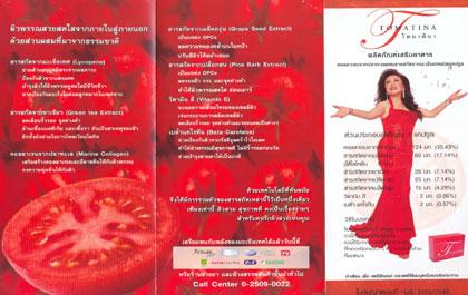 บริษัท โทมาตินา จำกัด เปิดตัวผลิตภัณฑ์เสริมอาหารโทมาตินา สารสกัดจากมะเขือเทศผสมคอลลาเจนจากปลาทะเล สารสกัดจากชาเขียว สารสกัดจากเมล็ดองุ่น วิตามินอี สารสกัดจากเปลือกสน และเบต้า-แคโรทีน ชนิดแคปซูล พิสูจน์พลังของมะเขือเทศได้แล้ววันนี้ที่ ฟาสซิโน จีเอ็นซี ร้านบู้ท หรือร้านขายยา และห้างสรรพสินค้าชั้นนำทั่วไป สอบถามได้ที่ 02-509-0022