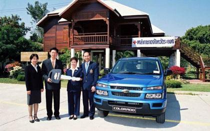 เสนอ จันทรา (ขวาสุด) ผู้ว่าราชการจังหวัดระยอง พร้อมด้วยภริยา พรรณี จันทรา นายกเหล่ากาชาดจังหวัดระยอง รับมอบรถยนต์ เชฟโรเลต โคโลราโด เพื่อเป็นรางวัลที่หนึ่งในงานกาชาดจังหวัด ซึ่งจัดขึ้นเมื่อเร็วๆนี้ โดยมี ไพรัช คุณอมรเลิศ กรรมการผู้จัดการ บริษัท ชลบุรี ออโตเซ็นเตอร์ จำกัด (พัทยา) และ นัทธมณ รัตนโรจน์ (ซ้ายสุด) เจ้าหน้าที่ฝ่ายรัฐกิจสัมพันธ์ บริษัท เจนเนอรัล มอเตอร์ส (ประเทศไทย) จำกัด และ เชฟโรเลต เซลส์ (ประเทศไทย) จำกัด เป็นตัวแทนในพิธีส่งมอบ
