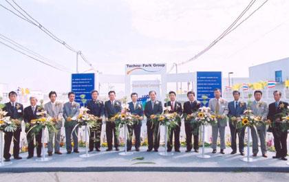 นายเสนอ จันทรา ผู้ว่าราชการจังหวัดระยอง (ที่ 7 จากขวา) เป็นประธานในพิธีเปิดโรงงานในนิคมอุตสาหกรรมอีสเทิร์นซีบอร์ด (ระยอง) ของกลุ่มบริษัท ทีที เทคโน-ปาร์ค ซึ่งพัฒนาโดยบริษัท เหมราชพัฒนาที่ดิน จำกัด (มหาชน) โดยมีนายสุชาติ พิศิษฐวานิช (ที่ 7 จากซ้าย) ที่ปรึกษาด้านการลงทุน สำนักงานคณะกรรมการส่งเสริมการลงทุน และนายประสบศิลป์ โชติมงคล (ที่ 6 จากซ้าย) ผู้อำนวยการฝ่ายปฏิบัติการ รักษาการรองผู้ว่าการปฏิบัติการ 2 การนิคมอตุสาหกรรมแห่งประเทศไทย รวมทั้งผู้บริหารกลุ่มทีที เทคโน-ปาร์ค ร่วมพิธี