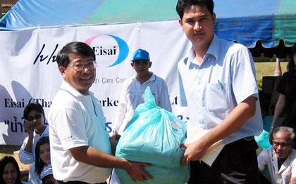ภก.ทวีศักดิ์ สีทองสุรภณา (ซ้าย) ประธานบริษัท เอไซ (ประเทศไทย) มาร์เก็ตติ้ง จำกัด เป็นตัวแทนบริษัทฯ เดินทางไปมอบยาและเวชภัณฑ์ รวมทั้งเครื่องอุปโภคที่จำเป็นให้กับโรงพยาบาลท้ายเหมือง จังหวัดพังงาเพื่อใช้ในการช่วยเหลือผู้ประสบภัยจากกรณีธรณีพิบัติภัยคลื่นยักษ์สึนามิถล่ม 6 จังหวัดชายฝั่งทะเลอันดามัน ซึ่งจังหวัดพังงานับเป็นจังหวัดที่ได้รับผลกระทบมากที่สุด โดยมี น.พ. พิสิฐ ยงยุทธ (ขวา) รักษาการผู้อำนวยการโรงพยาบาลท้ายเหมือง จ. พังงา เป็นตัวแทนรับมอบ
