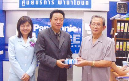 มร.ไดโซะ อิโตะ กรรมการผู้จัดการ บริษัท พานาโซนิค ซิว เซลส์ (ประเทศไทย) จำกัด มอบของที่ระลึกให้กับคุณพิทักษ์ อภิกุลชนา เจ้าของผู้ประกอบการห้างหุ้นส่วนจำกัด ยืนยงการไฟฟ้า เนื่องในโอกาสเยี่ยมชมและให้กำลังใจผู้แทนจำหน่ายสินค้าพานาโซนิคในจังหวัดที่ประสบภัยคลื่นยักษ์สึนามิ ณ ห้างหุ้นส่วนจำกัด ยืนยงการไฟฟ้า จ.ภูเก็ต