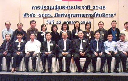 นายสมพล เกียรติไพบูลย์ ประธานกรรมการและ ประธานกรรมการบริหาร ธนาคารนครหลวงไทย จำกัด (มหาชน) (แถวนั่งที่ 5 จากซ้าย) เป็นประธานในการประชุมผู้บริหารประจำปี 2548 ในหัวข้อ “2005 … ปีแห่งคุณภาพการให้บริการ” ซึ่งเป็นแนวนโยบายและแผนงานในปี 2548 ของธนาคารที่มุ่งเน้นพัฒนาคุณภาพบริการเพื่อสร้างความพึงพอใจให้แก่ลูกค้า โดยมีคณะผู้บริหารและผู้จัดการสาขาจากทั่วประเทศเข้าร่วมประชุม ณ โรงแรมอมารี วอเตอร์เกท ประตูน้ำ กรุงเทพฯ เมื่อเร็วๆ นี้