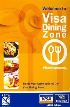 กรุงเทพฯ – 3 กุมภาพันธ์ 2548 – วีซ่า อินเตอร์เนชั่นแนล แบรนด์ชำระเงินชั้นนำของไทยและระดับโลก ร่วมกับร้านอาหารต่างๆ กว่า 80 ร้านย่านราชประสงค์จัดแคมเปญ “Visa Dinning Zone@Ratchaprasong” มอบสิทธิประโยชน์และส่วนลดแก่ผู้ถือบัตรวีซ่าและบัตรเดบิตวีซ่า อิเลคตรอน ตั้งแต่วันนี้ถึง 31 พฤษภาคม 2548 ผู้ถือบัตรวีซ่าและบัตรเดบิตวีซ่า อิเลคตรอน จะได้รับส่วนลด 10% หรือสิทธิพิเศษต่างๆ เมื่อชำระเงินด้วยบัตรวีซ่าที่ร้านอาหารย่านราชประสงค์ที่ร่วมรายการ อาทิ ร้านที่ตั้งในห้างเกษร พลาซ่า เอราวัณ กรุงเทพ และเซ็นทรัล เวิร์ล พลาซ่า เป็นต้น สำหรับผู้ถือบัตรซิตี้แบงก์ วีซ่า จะได้รับคะแนนสะสมเพิ่มเป็น 3 เท่าเมื่อชำระเงินค่าอาหารผ่านบัตรซิตี้แบงค์ วีซ่า