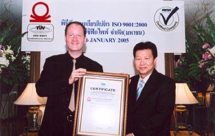 นายสมชัย กรรมการผู้จัดการ บริษัท แปซิฟิกไพพ์ จำกัด (มหาชน) (ขวา) ผู้ผลิตท่อเหล็กชั้นนำของไทย รับมอบประกาศนียบัตรรับรองระบบบริหารคุณภาพ ISO 9001: 2000 จากสถาบันอาร์ดับบลิว ทูฟ (ประเทศไทย) จำกัด โดยมี มร.โอลิเวอร์ โรเซ่ (ซ้าย) เป็นตัวแทนในการทอบ ณ โรงแรมแกรนด์ ไฮแอท เอราวัณ เมื่อเร็วๆ นี้ ซึ่งนับได้ว่าเป็นการบริหารด้านคุณภาพที่ประสบความสำเร็จอย่างต่อเนื่อง