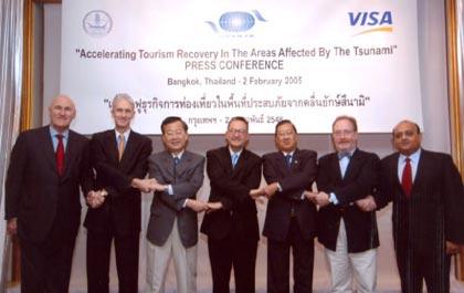 กรุงเทพฯ – 4 กุมภาพันธ์ 2548 – นายเจมส์ เมอร์เรย์ (ที่ 2 จากซ้าย) รองประธานบริหาร ประจำภูมิภาคเอเชียตะวันออกเฉียงใต้ วีซ่า เอเชีย แปซิฟิก ได้เข้าร่วมการประชุมสมัยพิเศษขององค์การการท่องเที่ยวโลก โดยที่ประชุมได้ให้ความเห็นชอบต่อแผนปฏิบัติการฉุกเฉินเพื่อช่วยฟื้นฟูธุรกิจการท่องเที่ยวในพื้นที่ประสบภัยคลื่นยักษ์สึนามิ นอกจากนี้ วีซาจะมีบทบาทสำคัญในการจัดทำข้อมูลด้านการใช้จ่ายของนักท่องเที่ยวและงานวิจัยต่างๆ เพื่อสนับสนุนให้ธุรกิจท่องเที่ยวกลับคืนสู่สภาพปกติได้อย่างรวดเร็วที่สุด