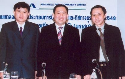 นายธนกร ฤทธิ์บันลือ (ซ้าย) ผู้อำนวยการฝ่ายบัญชีและการเงิน และนายชูศักดิ์ ยงวงศ์ไพบูลย์ (กลาง) กรรมการผู้จัดการ บริษัท เอเชีย เมทัล จำกัด (มหาชน) (AMC) ผู้ประกอบธุรกิจผลิตและจำหน่ายเหล็กรูปพรรณ และเจ้าของศูนย์บริการเหล็กครบวงจร และนายวิเชียร เอื้อสงวนวรกุล ผู้อำนวยการอาวุโสฝ่ายวาณิชธนกิจ (ขวา) บริษัทหลักทรัพย์ ซีมิโก้ จำกัด (มหาชน) ร่วมแถลงข่าวผลประกอบการปี 2547 และทิศทางธุรกิจปี 2548 เมื่อเร็วๆ นี้