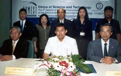 3 กุมภาพันธ์ 2548 – ฯพณฯ กร ทัพพะรังสี (แถวนั่ง – กลาง) รัฐมนตรีว่าการกระทรวงวิทยาศาสตร์และเทคโนโลยี เป็นประธานแถลงข่าวในโอกาสที่ประเทศไทยเป็นเจ้าภาพจัด “การประชุมคณะกรรมาธิการโลกว่าด้วยจริยธรรมในความรู้ด้านวิทยาศาสตร์และเทคโนโลยี (The World Commission on the Ethics of Scientific Knowledge and Technology – COMEST)” เพื่อส่งเสริมจริยธรรมด้านวิทยาศาสตร์และเทคโนโลยีบนพื้นฐานของการเคารพสิทธิมนุษยชน ความเสมอภาค อิสรภาพ วัฒนธรรม ค่านิยม สันติภาพและความอดกลั้น ซึ่งมีกำหนดจัดขึ้นที่โรงแรมอิมพีเรียล ควีนสปาร์ค กรุงเทพฯ ระหว่างวันที่ 23-25 มีนาคม ศกนี้ ทั้งนี้โดยมี ดร. ไพรัช ธัชยพงศ์ (แถวนั่ง – ขวา) ปลัดกระทรวงวิทยาศาสตร์และเทคโนโลยี และเจ้าหน้าที่ที่เกี่ยวข้องของกระทรวงฯ ร่วมถ่ายภาพด้วย.
