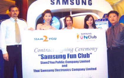 มร.นิคลาส สแตลเบอร์ก (ซ้าย) ประธานเจ้าหน้าที่บริหาร บริษัท สยามทูยู จำกัด (มหาชน) และนายอเนก อนันต์วัฒนพงษ์ (ขวา) ผู้จัดการฝ่ายการตลาด แผนกธุรกิจโทรคมนาคม บริษัท ไทยซัมซุง อิเลคโทรนิคส์ จำกัด ร่วมลงนามในสัญญาแต่งตั้งให้สยามทูยูเป็นผู้ให้บริการซัมซุงฟันคลับ โดยสยามทูยูจะพัฒนาระบบเพื่อรองรับกับการให้บริการเสริมของซัมซุงฟันคลับ ผ่านเว็บไซต์ที่ www.th.samsungmobile.com และทาง WAP ที่ wap.th.samsungmobile.com โดยเสนอคอนเทนท์ทั้งในรูปแบบเกมส์ วอลเปเปอร์ และริงโทน ที่มีคุณภาพเยี่ยม ซึ่งจะช่วยเพิ่มประสิทธิภาพในการให้บริการเสริมที่หลากหลาย และเพื่อสนับสนุนแผนการตลาดของซัมซุง รวมทั้งการนำเสนอบริการรูปแบบใหม่ๆ จากประสบการณ์ระดับมืออาชีพของสยามทูยู ที่โรงแรม เจดับบลิว แมริออท เมื่อเร็วๆ นี้
